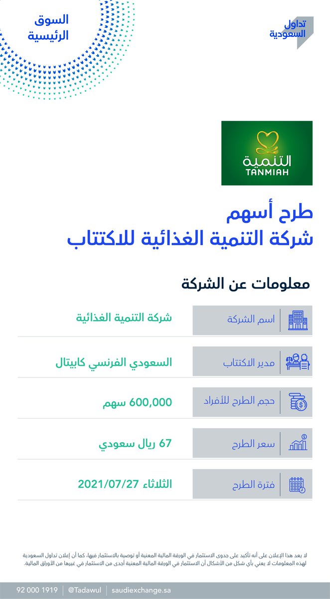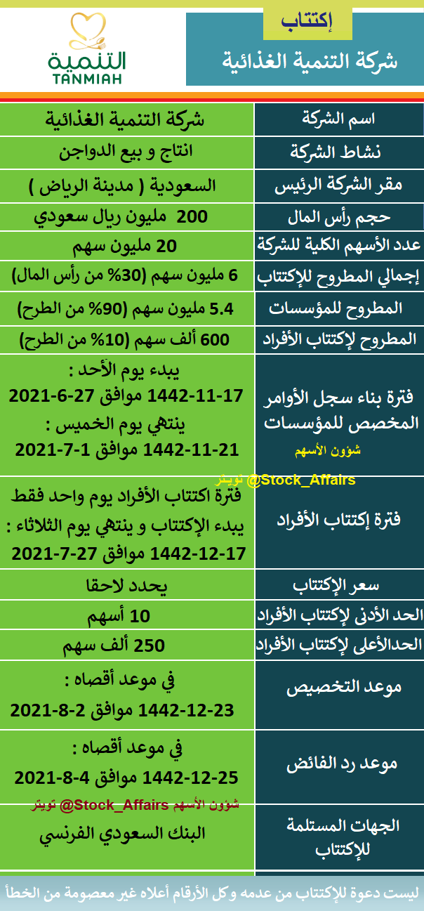 شؤون الأسهم No Twitter اكتتاب شركة التنمية الغذائية فترة اكتتاب الافراد يوم واحد فقط يبدء و ينتهي الاكتتاب يوم الثلاثاء 1442 12 17 موافق 27 7 2021 لمزيد من التفاصيل هنا