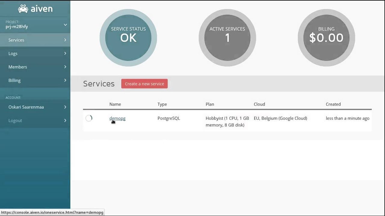 To create a new Aiven for Grafana service. Del Terminate a service. Aiven runs and manages Open Source database and backend messaging systems for our business customers around the world.