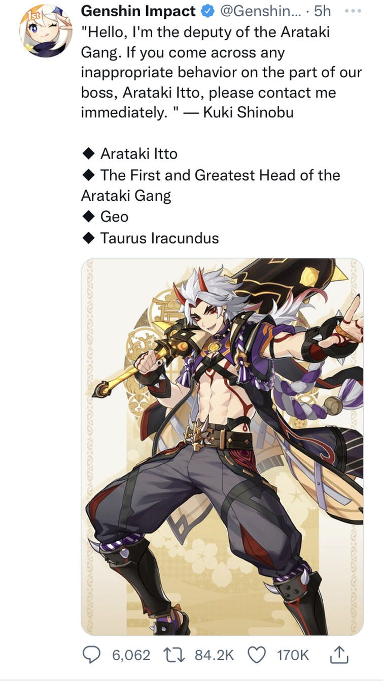 MiHoYo he doesnt let himself be intimidated and continues to present steady assist to the sport that has depopulated each in China and within the West. Genshin Impact 22 is anticipated to launch on Oct. In his appearance it can be seen that Arataki Itto is a Claymore user character and has Geo elements.